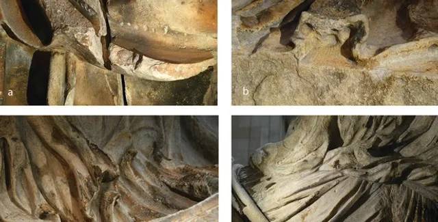 Дослідники знайшли переконливі докази того, що на деяких скульптурах були складні візерунки з людськими фігурами та візерунками з пальмового листя. Прикметно, що ці візерунки були вигадливо розфарбовані, щоб відповідати складкам і текстурі мармурової тканини, що лежить в основі скульптури.