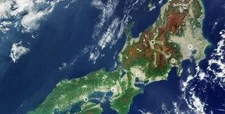 На знімку також можна добре розрізнити міські райони та оброблювані землі, які різко контрастують із сірими тонами. Більшу частину території східного узбережжя Хонсю займає столиця Японії — Токіо. Цей мегаполіс, широко відомий як Великий Токіо, простягається навколо Токійської затоки і є домівкою для близько 37 мільйонів осіб, що робить його найбільшим мегаполісом у світі.