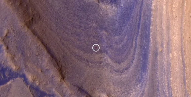 На знімку, зробленому з орбіти Марса, видно марсохід, що долає перешкоди в долині Гедіз.