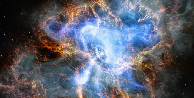 За допомогою об'єднання інфрачервоних даних телескопа Вебб і рентгенівських даних телескопа Чандра вчені отримали унікальне складене зображення Крабовидної туманності. Це дає можливість дізнатися більше інформації про щільну нейтронну зірку, що знаходиться в центрі одного з найяскравіших залишків наднової.