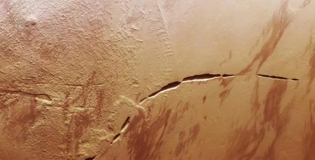 Новий знімок поверхні Марса зробив апарат Європейського космічного агентства Mars Express. На знімку зображено темний нерівний шрам, що прорізає поверхню біля підніжжя гігантського вулкана, пише ESA.