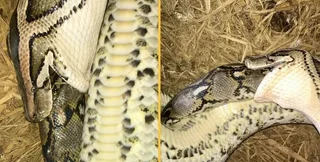 Дослідники показали, як 10-метровий бірманський пітон цілком проковтує сітчастого пітона всього за дві години.