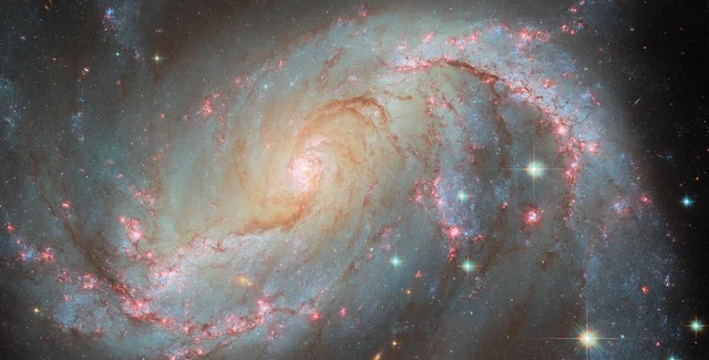 На зображенні NGC 1672 видно мільярди зірок у закручених спіральних рукавах галактики, які випромінюють дуже яскраве світло. Ще сильніше випромінювання випускають молоді та дуже гарячі зірки. Їхнє світло представлене яскравим червоним кольором на знімку.