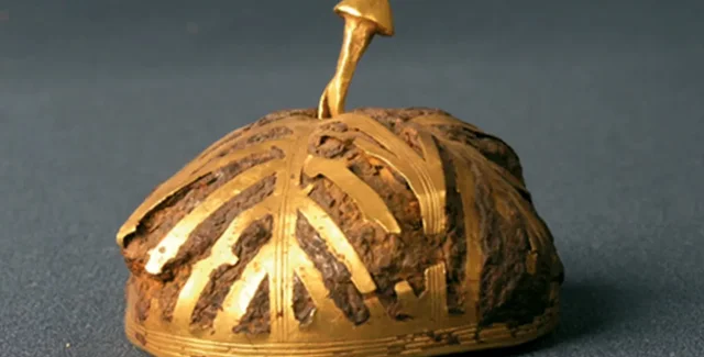 "Передбачається, що вік скарбу перебуває в межах пізнього бронзового століття (1400-1200 рр. до н. е.). Але два предмети зі скарбу досі збивали з пантелику дослідників. Йдеться про два металеві предмети: невелику порожнисту півсферу, що вкрита ажурним листом золота, та браслет", — кажуть автори дослідження.
