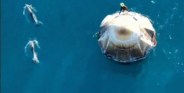 Кадри з дрона показують, як дельфінячі плавники з'являються навколо обгорілого космічного корабля, поки він гойдається на воді.