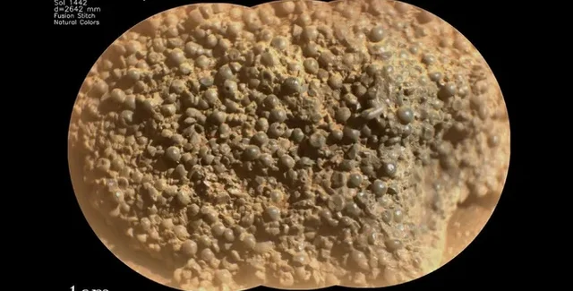 Крупний план незвичайної марсіанської породи, що складається із сотень темних круглих сфер | Фото: NASA
