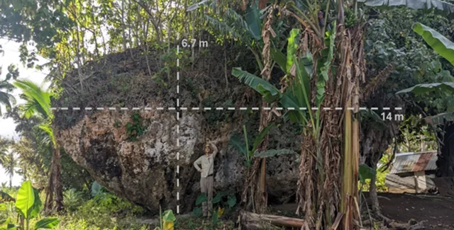 За словами аспіранта Університету Квінсленду Мартіна Келера, вони з колегами були вельми здивовані виявити валун у цьому місці — він знаходився далеко в глибині суші за межами нашої польової робочої зони. Команда припускає, що він був переміщений дійсно величезним цунамі.