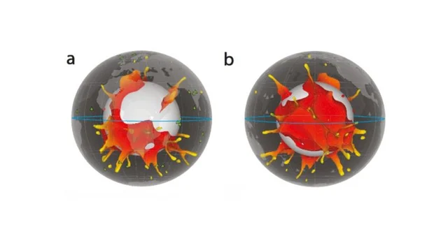 Коли розпечені колони гірських порід (мантійні плюми) підіймаються з глибини майже 3000 кілометрів, виникають вулкани, подібні до тих, що знищили більшу частину життя на Землі, зокрема, й динозаврів.