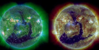 На зображенні Solar Dynamics Observatory корональну діру видно у вигляді величезної темної плями, яка тягнеться по всьому сонячному диску