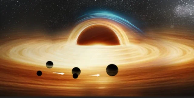 Ілюстрація показує злиття двох чорних дір в одну в присутності третьої більшої чорної діри | Фото: ScienceAlert