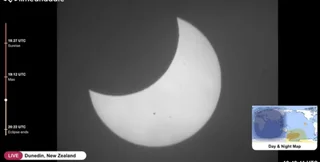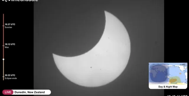 Зображення нижче було зроблено під час прямої трансляції порталу Time and Date майже на самому початку затемнення, коли Місяць почав рухатися зліва направо по яскравому диску нашої зірки. Члени Данідінського астрономічного товариства змогли сфотографувати частково закритий диск Сонця в небі над Новою Зеландією.