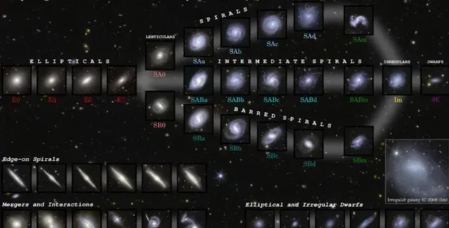 Астрономи знають, що форма галактик, від спіральних, таких як Чумацький Шлях, до еліптичних, пов'язана з ходом їхньої еволюції з плином часу. Нові дані дали змогу створити діаграму "галактичного камертона", на якій праворуч показано галактики, в яких формуються зірки, що зміщуються вліво в міру зростання і злиття з іншими галактиками, що в кінцевому підсумку призводить до утворення величезних еліптичних галактик.
