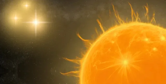 Астрономи з'ясували, що три пов'язані між собою зірки мають більшу масу і температуру, ніж Сонце. А четверта зовнішня зірка холодніша і менш масивна, а отже вона схожа на Сонце.