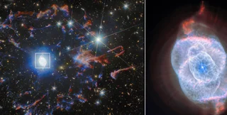 На фотографії телескопа Хаббл добре видно різноманітні газові структури, розташовані в ядрі туманності "Котяче око". Цей знімок додає цілісності зображенню телескопа Евклід і дає максимально повне уявлення про цей дивовижний об'єкт. Вважається, що структури в ядрі туманності відображають епізодичний характер викиду речовини зіркою, що вмирає. І вони показують різні етапи останніх стадій життя колись масивної зірки.