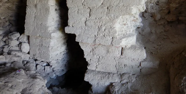 Над ним дослідники помітили сліди пофарбованого штукатурного покриття, в якому досі збереглися білі, помаранчеві та червоні пігменти. Верхній шар має ознаки обвалу, оголивши основи сходів та елементи попередніх будівель. Розмір та глибина цих залишків свідчили про те, що під ними можуть бути приховані ще давніші шари.
