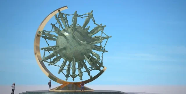 Молекула коронавірусу із зубцями матиме форму Землі, на поверхні якої стоять люди, взявшись за руки. При цьому кожна фігура складатиметься із тисяч людей, що обіймаються, які знаходяться одна в одної на плечах і символізуючи різні соціальні групи та їх цінності, об'єднані однією проблемою — пандемією.