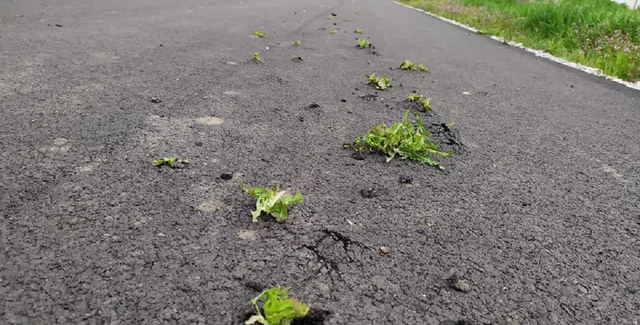 Вона опублікувала фото, на якому кульбаби проросли крізь асфальтне покриття на досить великій ділянці дороги. Символічно, що вулиця, де це сталося, називається Зеленою. Авторка публікації звернула увагу, що асфальт поклали зовсім нещодавно — у вересні 2020 року.