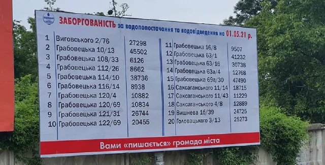 У місті Стрий Львівської області водоканал оприлюднив адреси найбільш злісних боржників з оплати комунальних послуг, розмістивши їх на бігбордах. Про це повідомляє "ТСН".