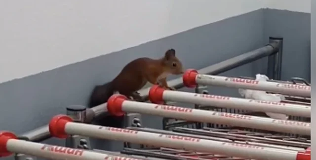 Спочатку дикий гризун просто бігав з одного боку в інший, однак згодом розташувався на перилах поруч із візками для продуктів біля входу в торговий зал.