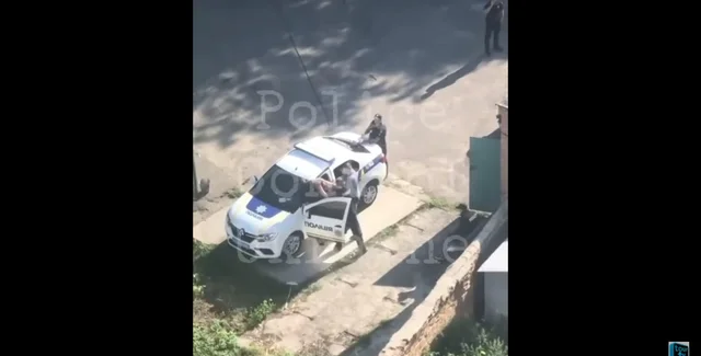 Двоє поліцейських вирішили з'ясувати стосунки із застосуванням фізичної сили, а за бійкою копів біля патрульного автомобіля спостерігали їхні колеги по службі.