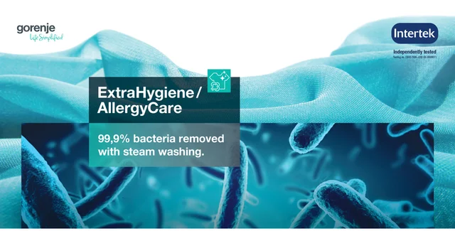 Після завершення циклу прання запускаються додаткові 20 хвилин обробки парою. Барабан наповнюється парою, яка проникає у кожне волокно. Завдяки вищій температурі пара усуває до 99,9% бактерій. Незалежне тестування Intertek протестувала вибрані пральні машини Gorenje на знищення двох найпоширеніших бактерій, що викликають медичні інфекції, кишкової палички (коротко E. Coli) і золотистого стафілокока. випробування пройшли успішно, отримавши схвалення від відомого постачальника повної гарантії якості для галузей промисловості по всьому світу Intertek.