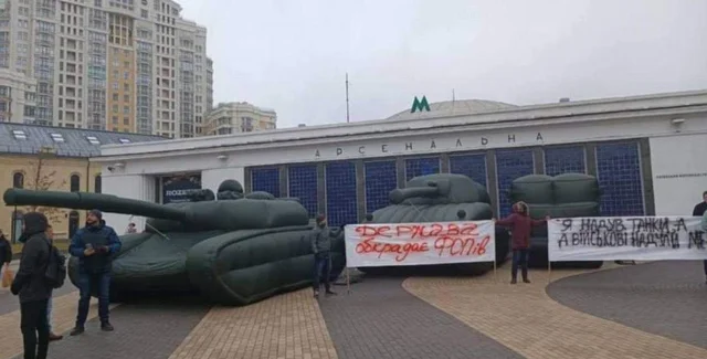 У Києві біля входу біля станції метро "Арсенальна" з'явилася дивна інсталяція — туди підігнали кілька надувних видів військової техніки. Спочатку ідея та мета акції була незрозумілою, повідомляє "24 канал".