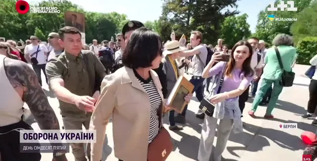 За її словами, група телеканалу "1+1" вирушила до Берліна у тому числі для того, щоб зняти, як росіяни відзначають День перемоги над нацизмом у Німеччині. Після того, як громадяни РФ почули українську мову в Трептів-парку, на адресу журналістів посипалися погрози та образи.