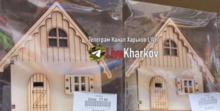 Судячи з фото, на полиці продавався різдвяний будиночок з дерев'яними дверима та конструкцією для укріплення у вигляді цього символу. Ціна виробу — 77 гривень.