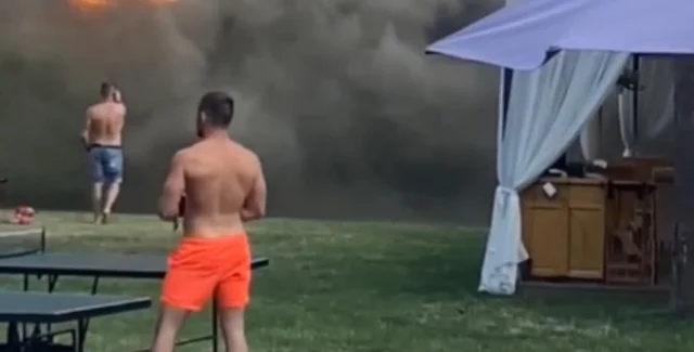 На записі видно, що відпочивальників мало бентежить загоряння на території елітного заміського комплексу. Гості продовжують спокійно грати в настільний теніс на тлі палаючої будівлі.