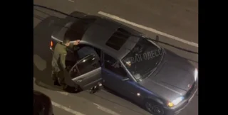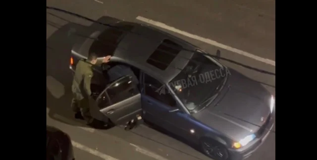 На кадрах можна помітити, що всередині автівки знаходиться людина. Ще одна особа стоїть біля задніх дверей машини, на відео її видно лише частково. Тим часом, чоловік у військовій формі нагинається до відчинених дверей та, ймовірно, комусь погрожує.