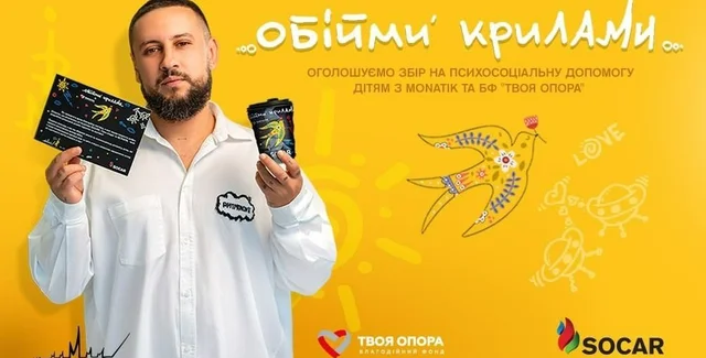 Сьогодні на АЗК SOCAR стартував благодійний проєкт "Обійми крилами" у співпраці з MONATIK та благодійним фондом "Твоя опора". В рамках проєкту – з продажу спеціальних благодійних горняток та листівок – збиратимуться кошти для Сімейного центру ментального благополуччя "Твоя опора". Також долучитися до проєкту можна зробивши благодійний внесок у застосунку SOCAR.