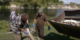 Добровольці працюють у масках і рукавичках, виловлені рибини ховають під землею. Мешканець села Володимир розповів, що маски одягли не просто так — через довге перебування поблизу води сильно погіршується самопочуття.