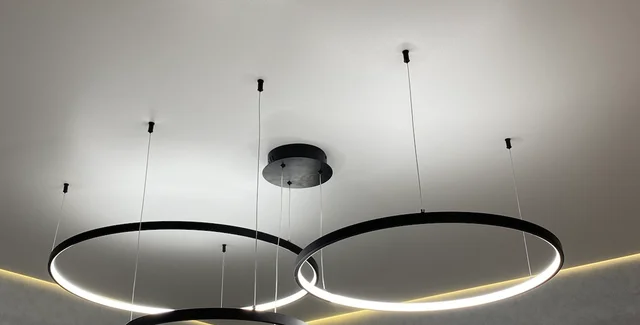 - Вбудовані світлодіодні смуги та світлові панелі — найбільш актуальні елементи освітлення для сучасних натяжних стель. Серед їхніх численних переваг — підвищення рівня пожежної безпеки та економія електроенергії.