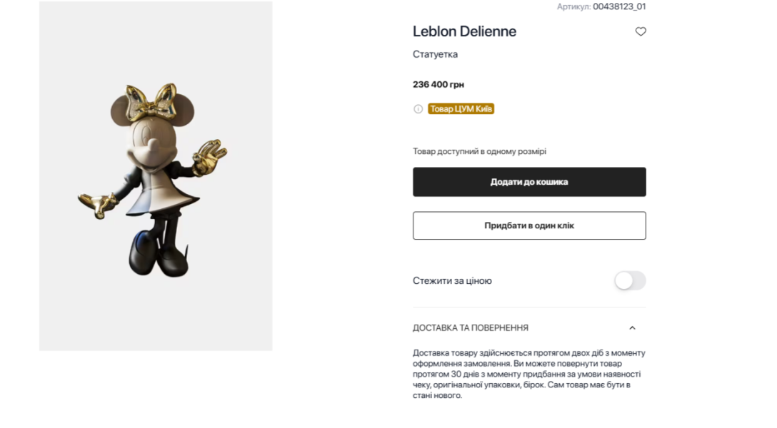 У столичному ЦУМі виставлені на продаж скульптури героїв мультфільмів від французької майстерні Leblon Delienne. Ціна найдешевшої з них — більш як 7 тисяч гривень, а вартість найдорожчої — 259 900 гривень, що сягає майже 6 тисяч гривень.