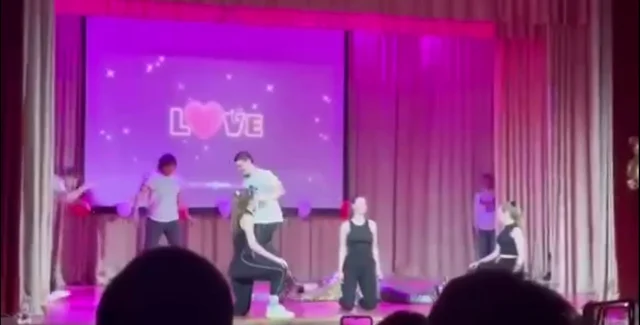 На відео зафільмований фрагмент святкового концерту. Під час номеру на сцену виходить людина у військовій формі з папкою в руках. До нього підходить хлопець у цивільній формі і одним ударом збиває його із ніг.