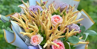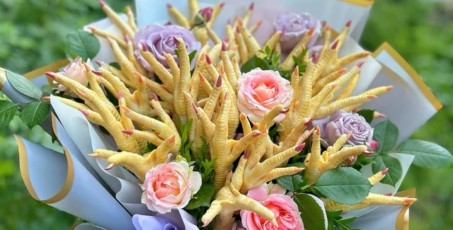 Флористка, яка виготовляє їстівні букети, показала свою роботу, яка здивувала користувачів. Основою оригінального подарунка стали курячі лапки. Десятки лапок погнали з живими квітами й загорнули у подарункову упаковку. Додатковим акцентом стало те, що кігтики на лапках пофарбували в рожевий колір.