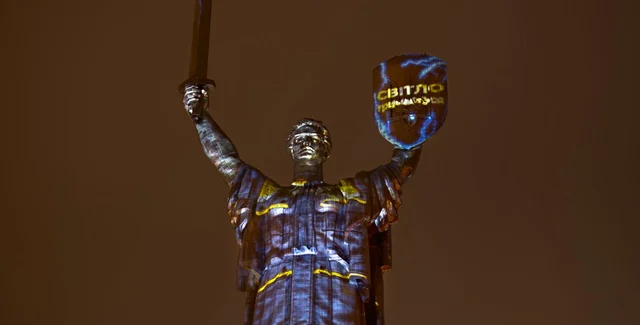 Українські енергетики символічно підсвітили монумент Батьківщина-Мати. Скульптуру освітили національними кольорами та написом "Світло тримається!".