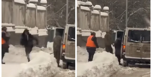 Після цього представниця поліції кинулася у бік жінки, що прибирала сніг, та вдарила її ногою. Далі вона послизнулась на снігу та впала, однак швидко підвелася і ще раз штовхнула двірничку.