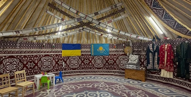 Юрта всередині прикрашена килимами. Тут кияни мають змогу не лише відпочити, а й познайомитися з культурою Казахстану, його народними костюмами, інструментами та традиціями. Вона працюватиме з 09:00 до 20:00.