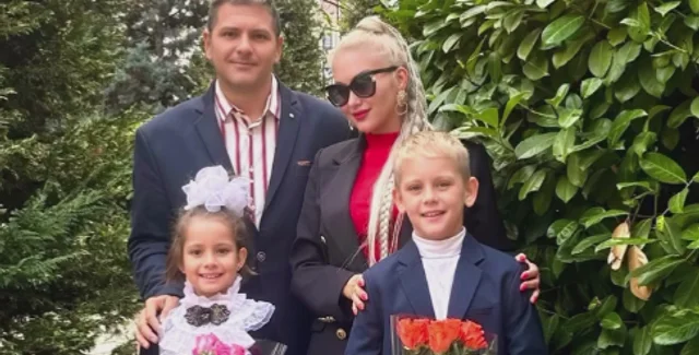 Її чоловік для заходу обрав офіційний темно-синій костюм і білу сорочку в червону смужку. Діти були теж одягнені святково, на лінійку сім'я взяла з собою домашнього улюбленця — невеликого песика. Двійнята позували зі своїми батьками, тримаючи в руках букети троянд.