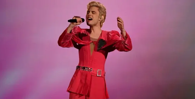 - Даниїл Лещинський (вокаліст): вийшов на сцену в яскраво-рожевому костюмі з глибоким вирізом, масивним поясом та декоративним серцем на грудях.