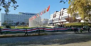 Перед будівлею Ради Європи люди стояли з прапорами держав Кавказу, серед них 50-метровий прапор Чеченської республіки Ічкерія. Протестувальники скандували "Геть російських окупантів".