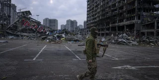 Солдат ЗСУ біля зруйнованого ТЦ "Ретровілль" у Києві. | Фото: AP