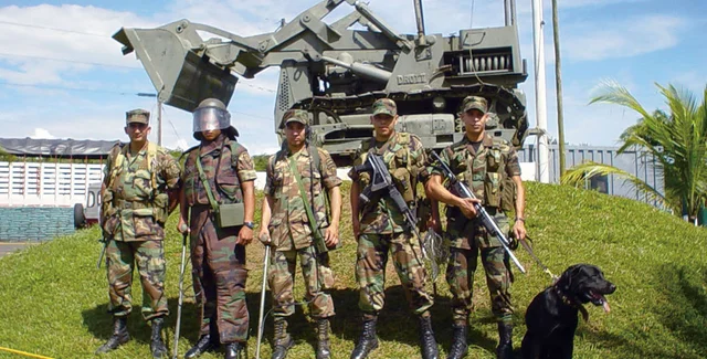 Колумбійський інженерний загін із детекторами мін і собакою, навченою знаходити бомби