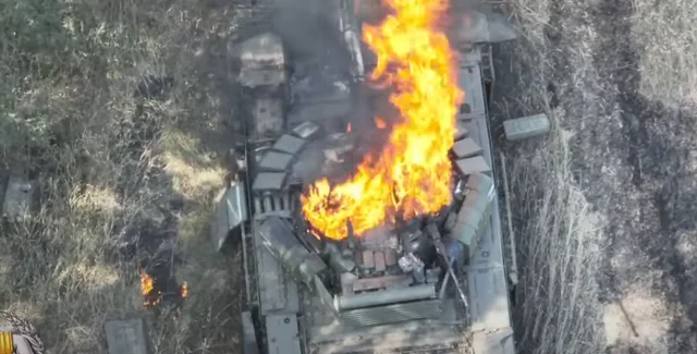 Військові скинули з дрона снаряд, який влучив прямісінько у відкритий люк танка. Через це один із них повністю згорів.