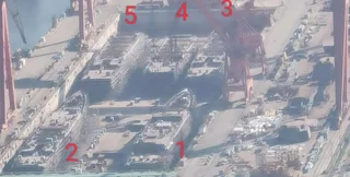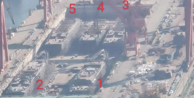 Один із користувачів китайської соцмережі Weibo опублікував фотографію з верфі Далянь на півночі Китаю. Це одна з двох у своєму роді верфей, де можуть будувати такі судна як есмінці. На ній видно, як відразу п'ять есмінців типу 052D споруджують на одній верфі.