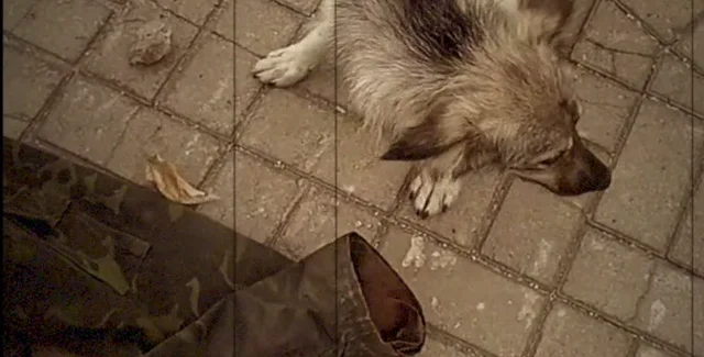 На кадрах видно, що чорно-білий бездомний пес тягне в зубах камуфляжну куртку. Одяг забруднений землею.