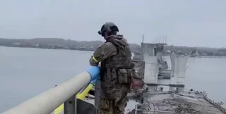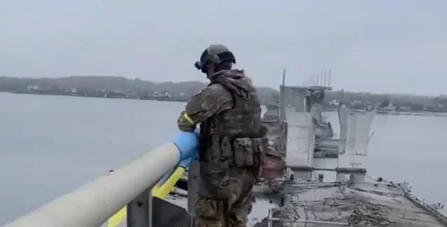 Він опублікував відео, де видно, як боєць Збройних сил України вішає національний прапор на мосту. Він з'єднував правобережну та лівобережну частину Херсонської області, проте його підірвали російські військові під час втечі з обласного центру.