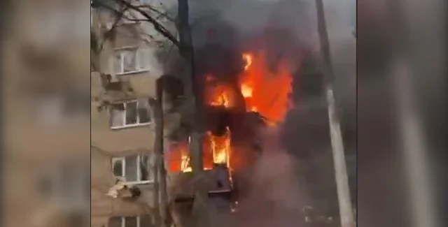 Заступник голови Офісу президента України Кирило Тимошенко показав наслідки влучення ракет. На відео видно, як частина п'ятиповерхівки горить із 1-го по останні поверхи.