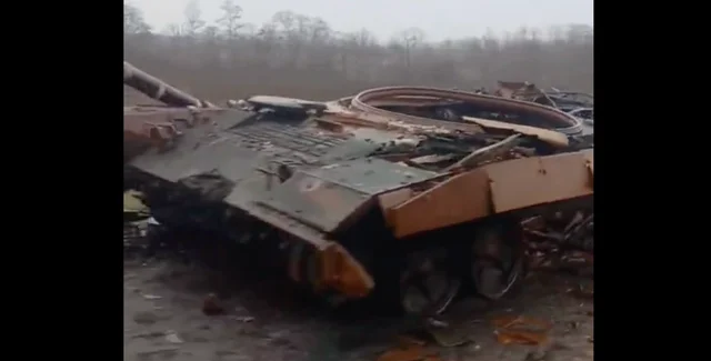 У кадр потрапляє два танки, які були знищені ударом, імовірно, HIMARS. Т-90М "Прорив" вдалося встановити по задній частині корпусу, де видно додаткову силову установку.